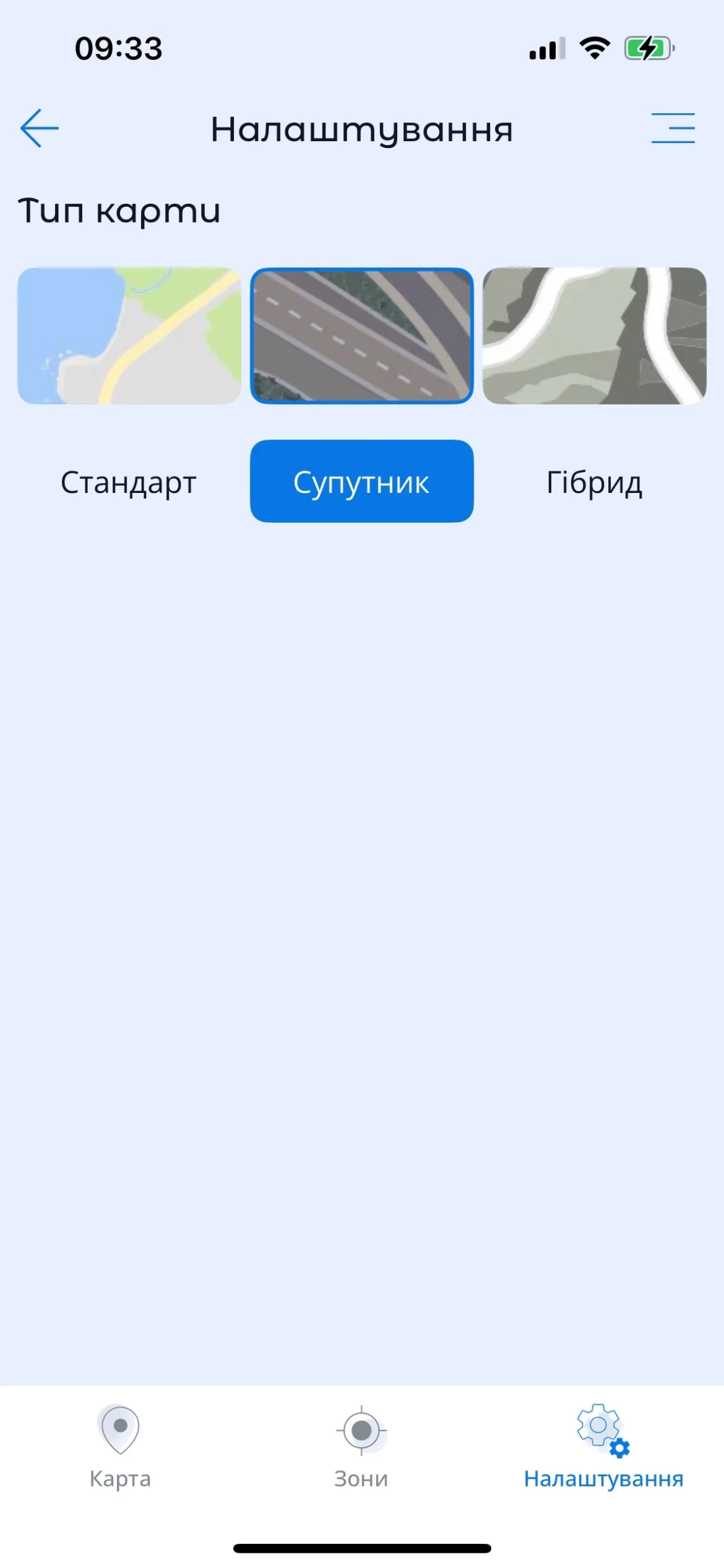 Ви можете побачити час і дату останнього оновлення геолокації вашої дитини. Якщо термін дії даних закінчився, необхідно натиснути кнопку «Оновити». Перейшовши до налаштувань, ви можете змінити режим відображення карти: гібридний, супутниковий або стандартний.