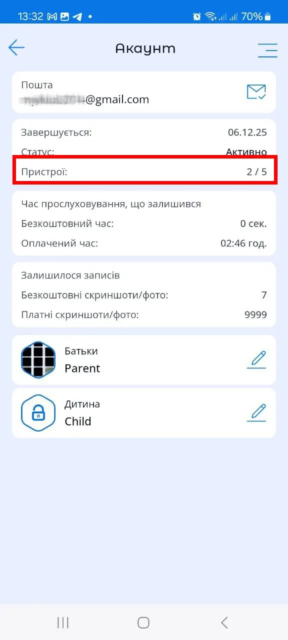 За замовчуванням ви маєте можливість додати в застосунок до 5 пристроїв із різними ролями у довільних комбінаціях. Наприклад: 1 мати/батько та 4 дитячих, 2 мати/батько та 3 дитини, 1 мати/батько та 1 дитина і так далі.