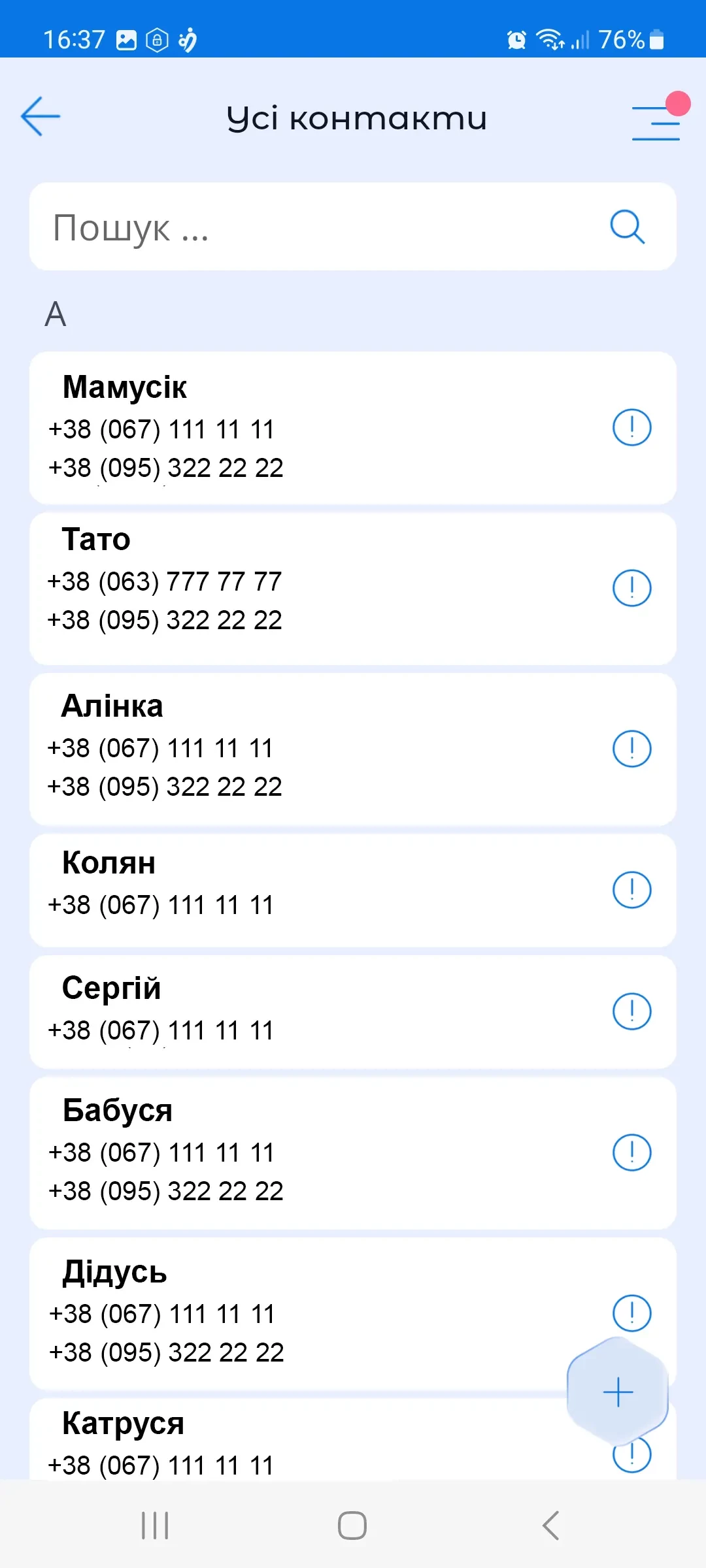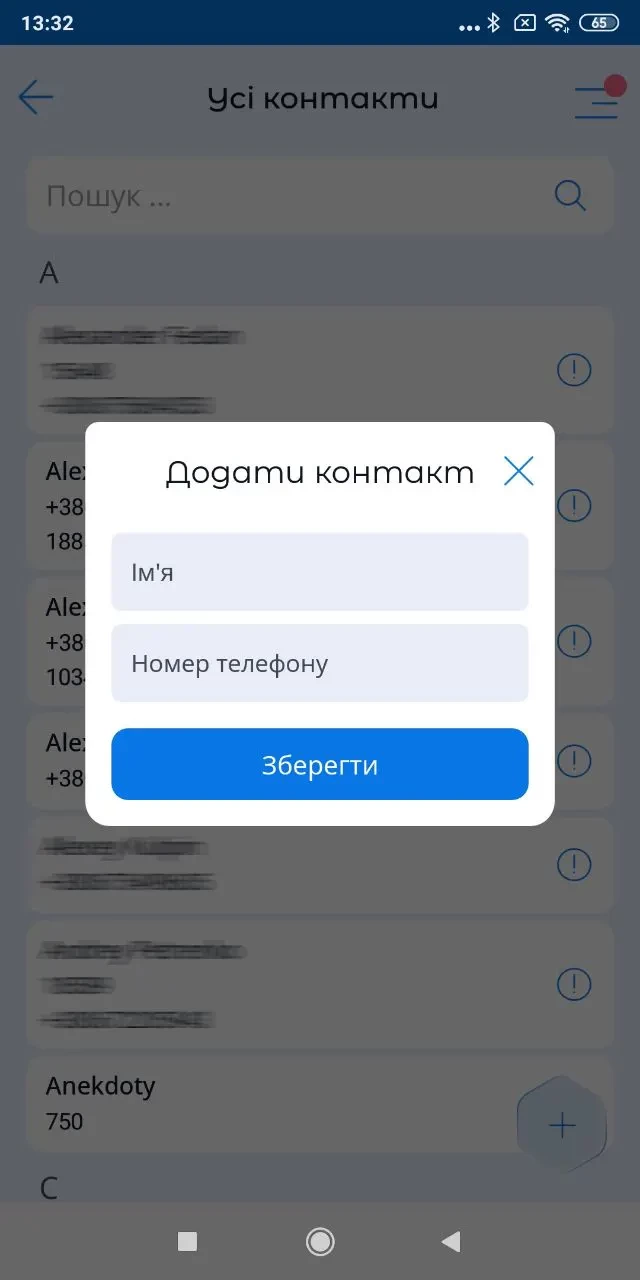 Щоб додати контакт, натисніть кнопку «+» внизу екрана.