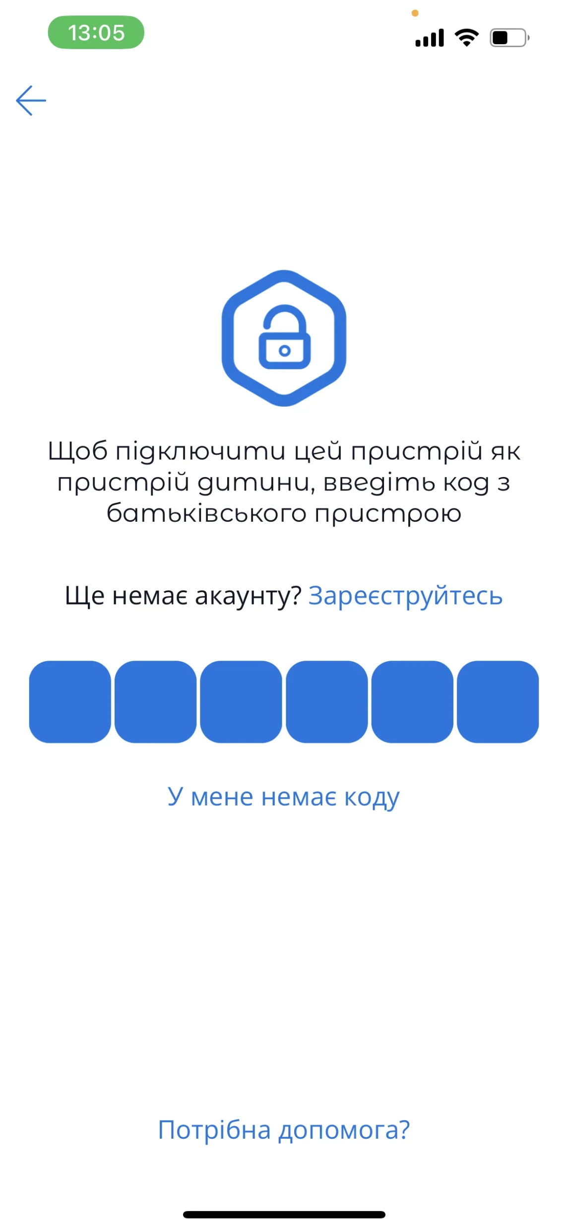 Якщо до Вашого облікового запису ще не додано жодного дитячого пристрою, Ви побачите екран із кодом для підключення дитячого пристрою.