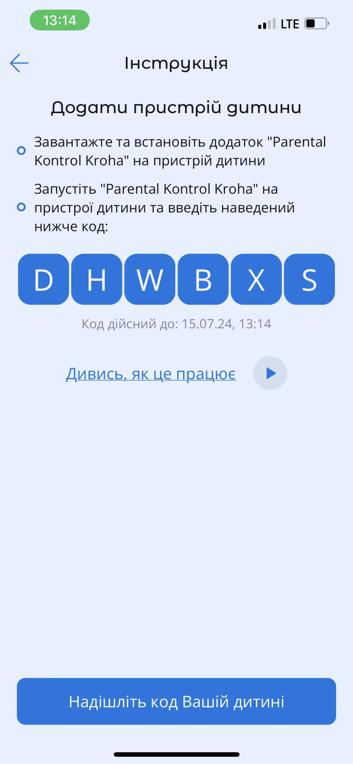 Якщо вже є підключені дитячі пристрої та Ви хочете додати ще один, натисніть кнопку "Додати пристрій дитини", щоб отримати код.