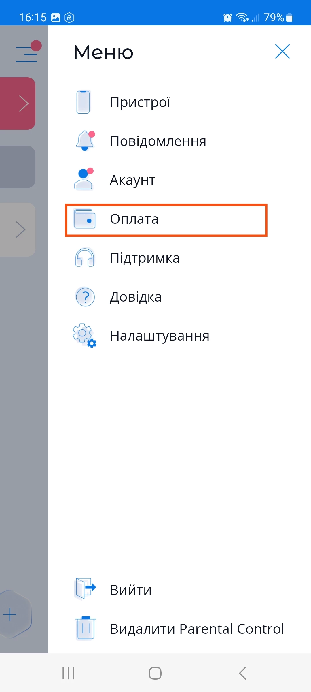 - натиснути на іконку меню у правому верхньому куті та перейти в меню "Оплата";