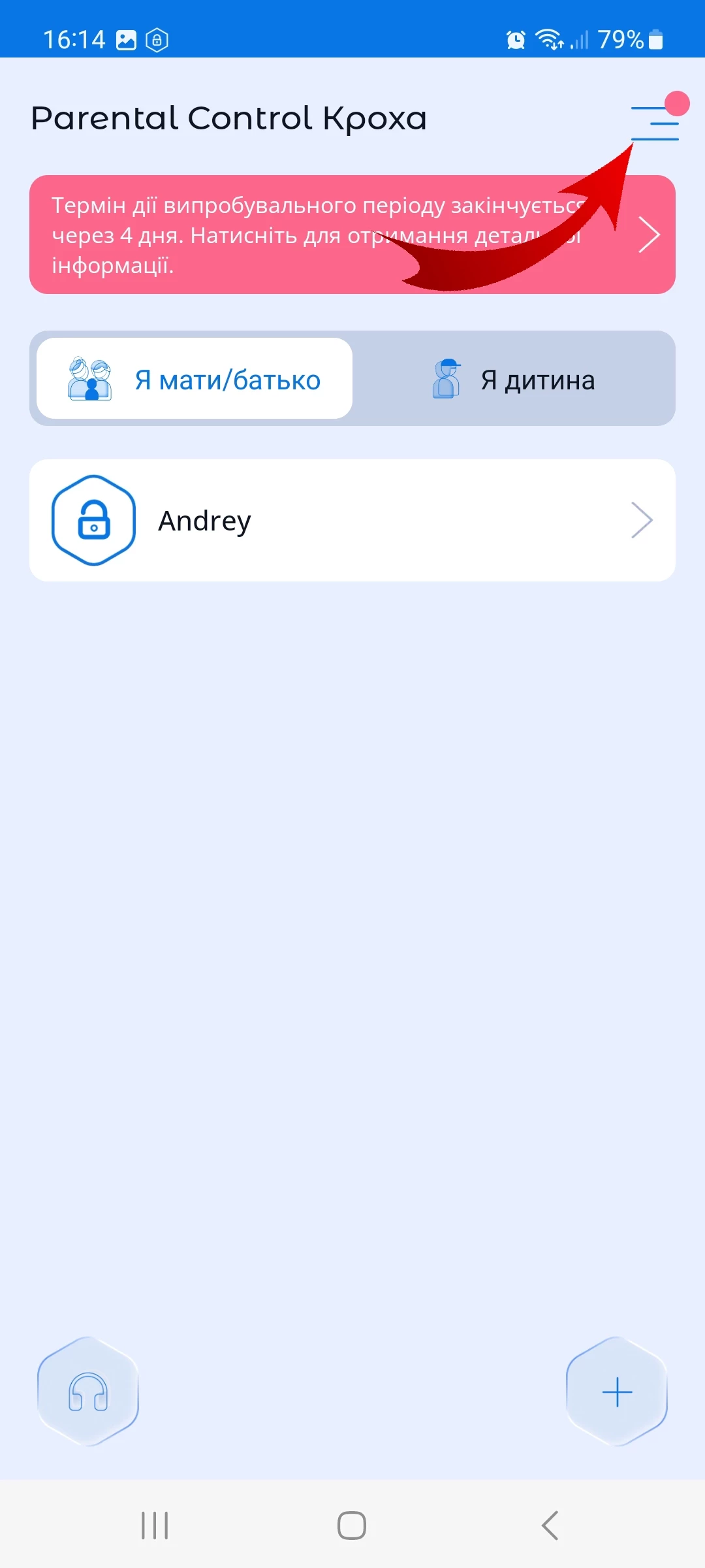 - відкрити застосунок Батьківський контроль Kroha;