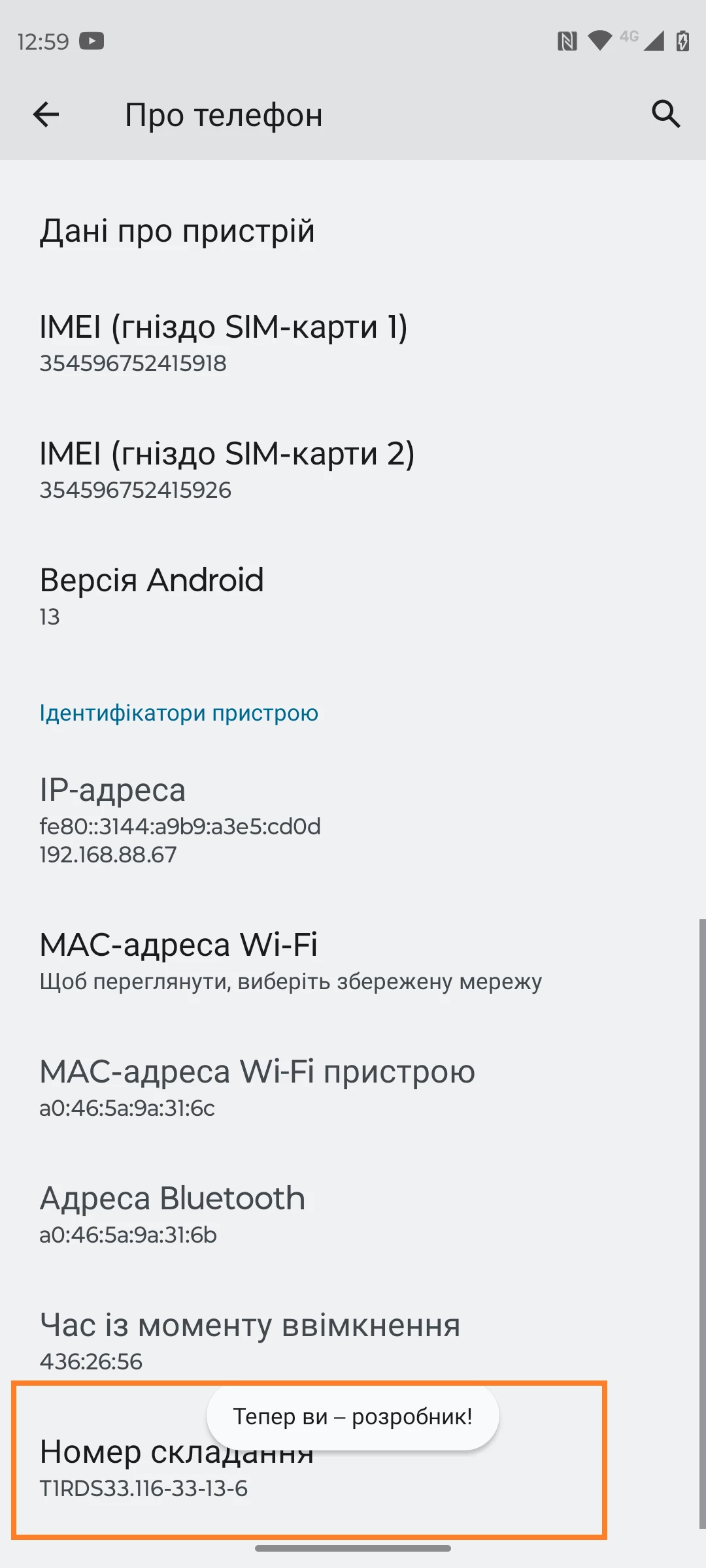 - Знайдіть пункт "Номер складання" і швидко натисніть на нього 5-8 разів.