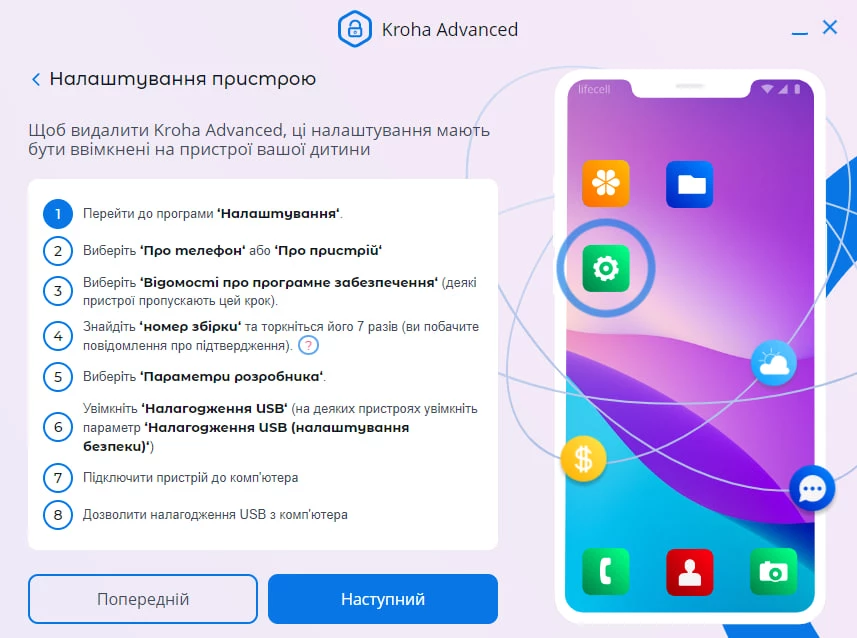 Якщо на дитячому пристрої встановлено розширену версію Kroha Advanced, використовуйте наступні інструкції, щоб видалити застосунок: