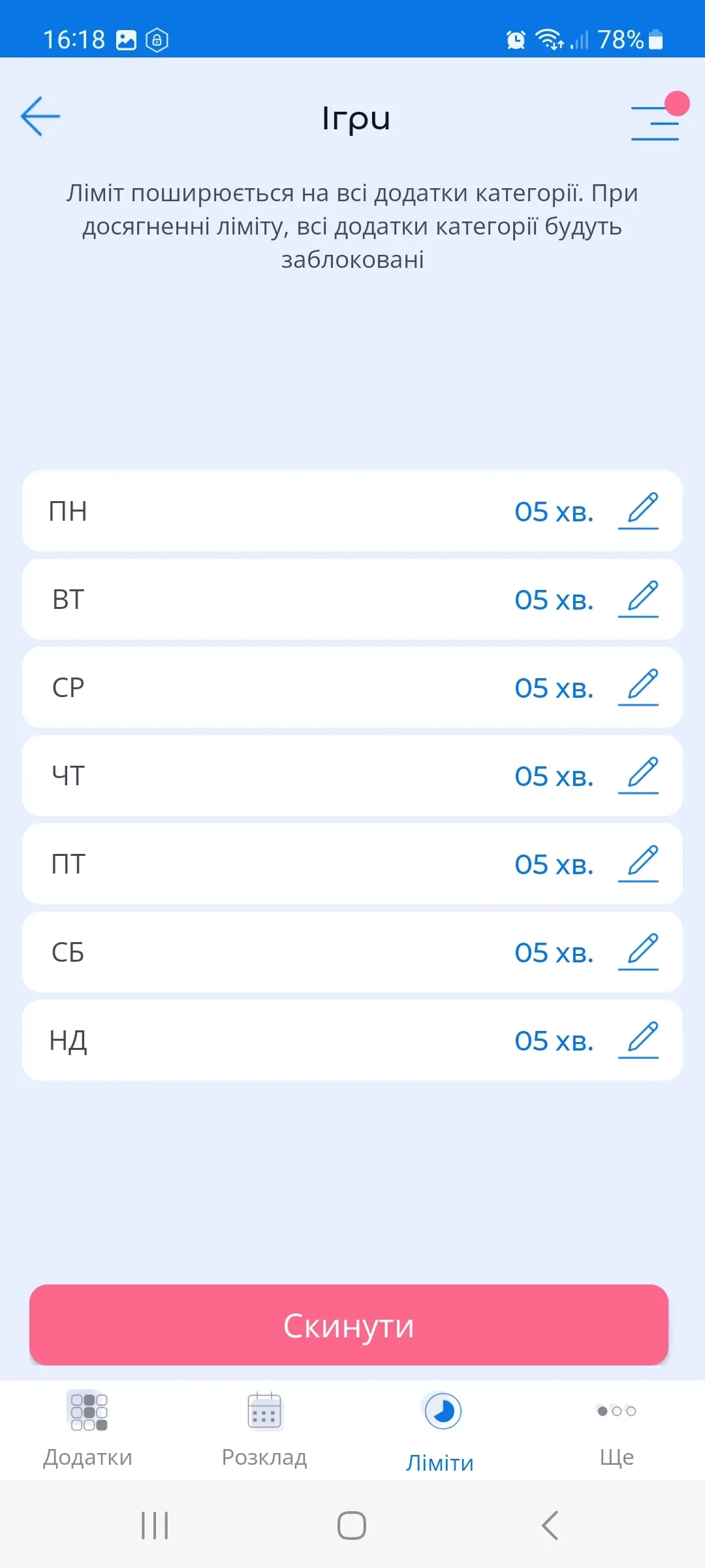 У розділі "Блокування додатків", меню "Ліміти" батьки можуть встановити добовий ліміт для використання застосунків обраної категорії на кожен день тижня.