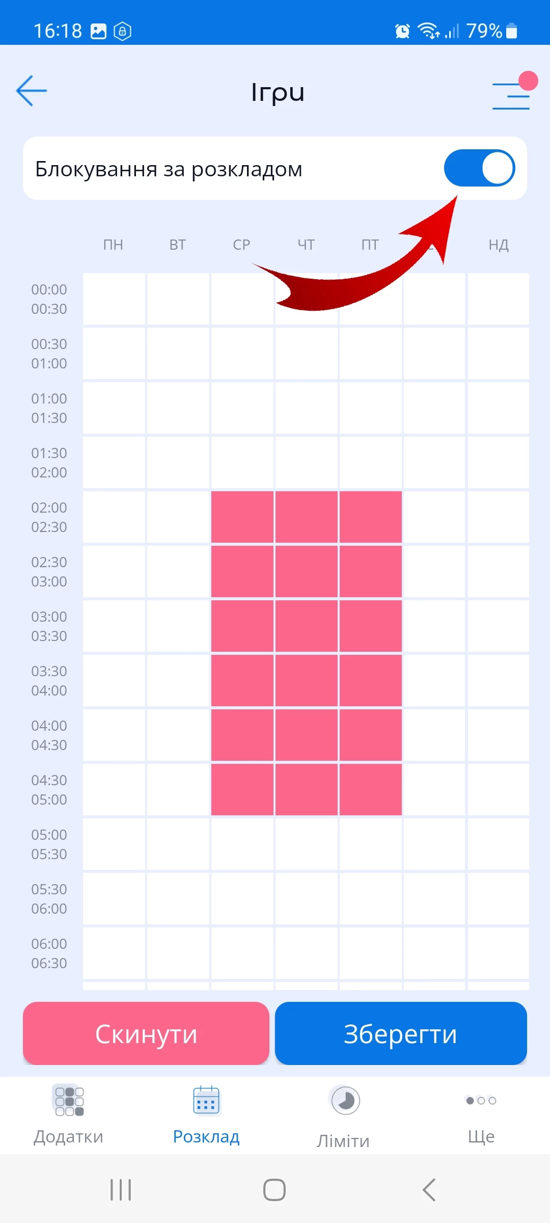 Для встановлення розкладу у функції «Блокування програм» батьки налаштовують блокування застосунків у період часу, коли дитина не повинна відволікатися на ігри, перегляд відео або спілкування в соціальних мережах (наприклад, у школі). Заблокуйте потрібний період часу, затиснувши комірку початку періоду та довівши виділення комірок до кінця періоду блокування. Активуйте перемикач "Блокування за розкладом". Час, що відповідає виділеним коміркам, буде заблоковано для додатків вибраної категорії.