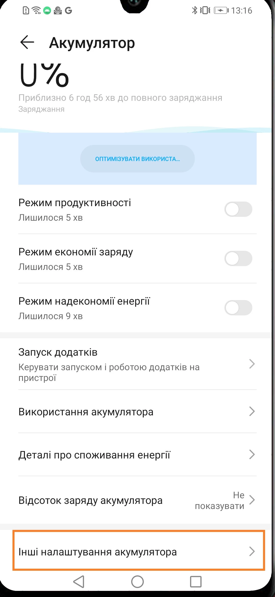 - Поверніться до розділу "Акумулятор" > відкрийте розділ "Інші налаштування акумулятора" (на інших прошивках у верхньому правому куті натисніть на іконку налаштувань) > вимкніть повідомлення про виявлення енергоємних програм.