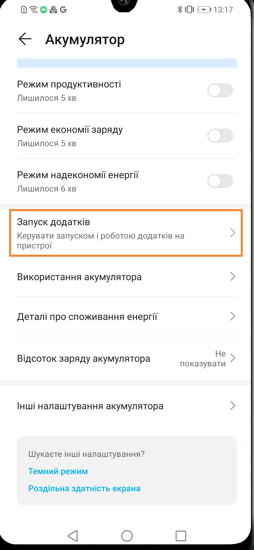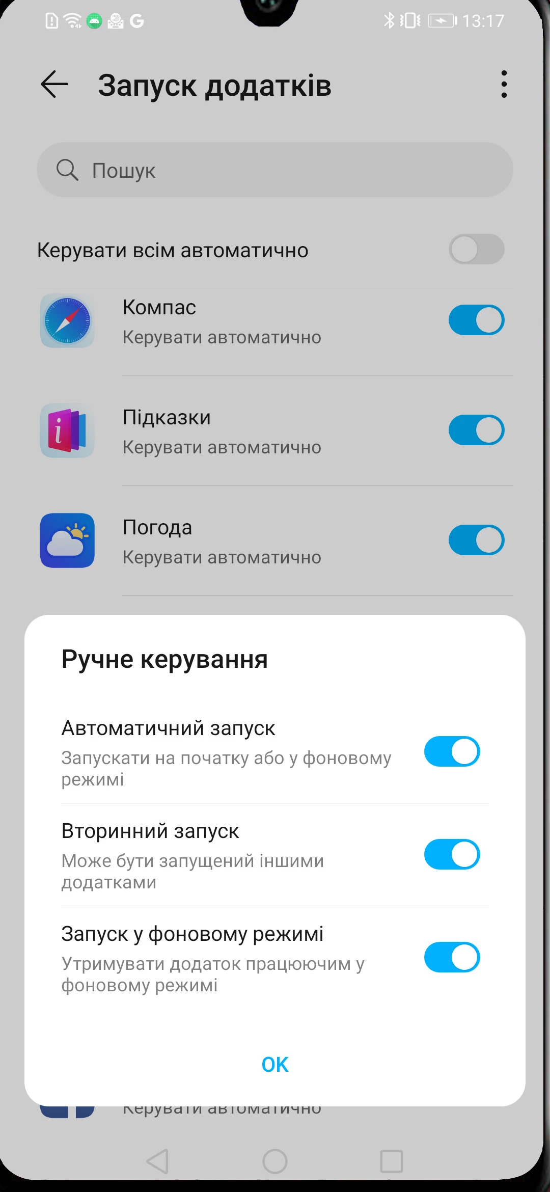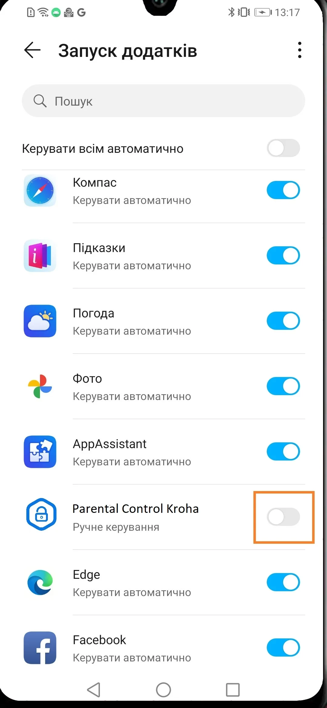 - Відкрийте "Налаштування" на дитячому пристрої > відкрийте розділ "Акумулятор" > відкрийте розділ "Запуск додатків" > знайдіть застосунок Parental Control Kroha > вимкніть перемикач навпроти назви Parental Control Kroha > з'явиться вікно "Ручне керування". У цьому вікні всі перемикачі повинні бути включені: "Автоматичний запуск", "Вторинний запуск", "Робота у фоновому режимі".