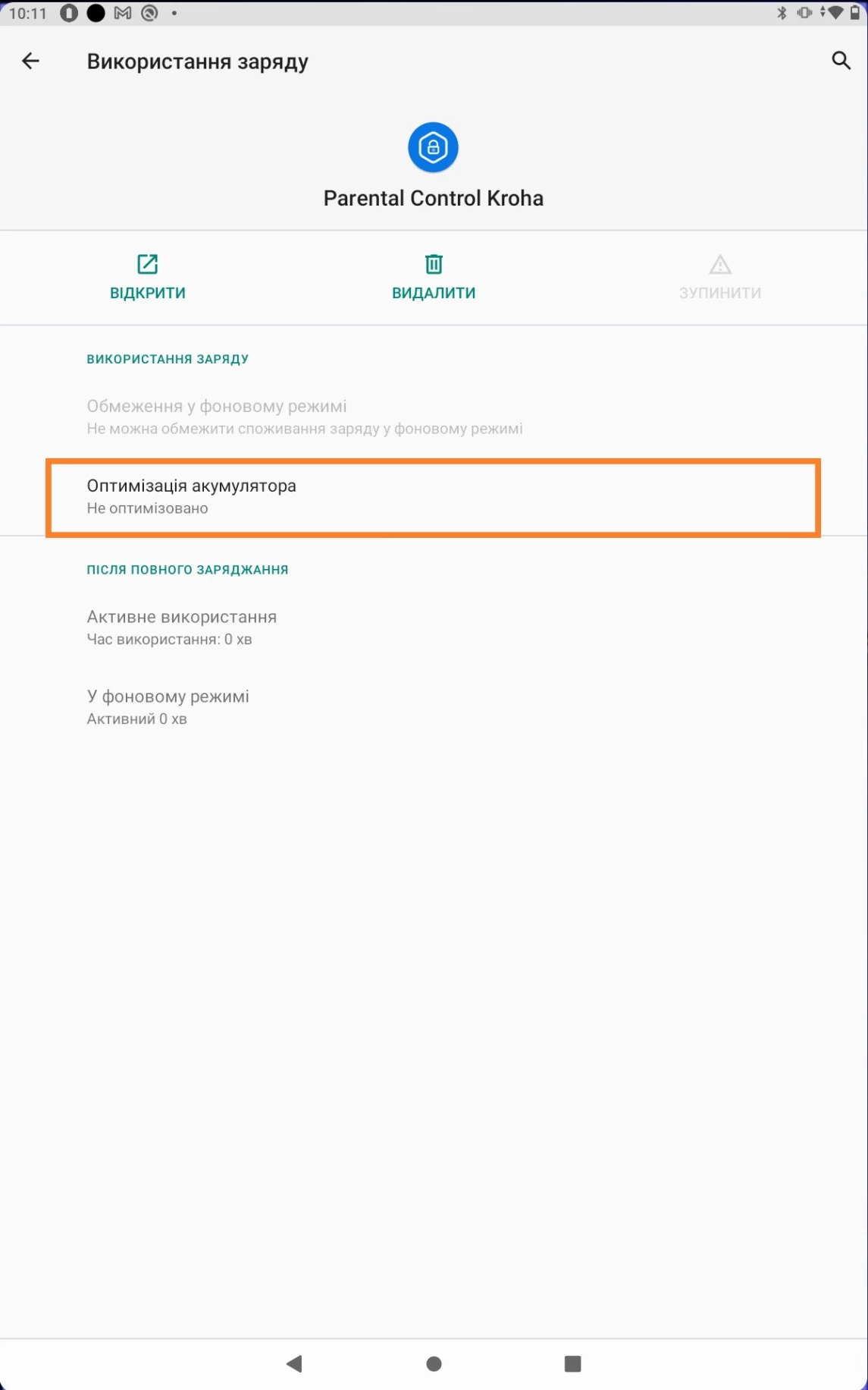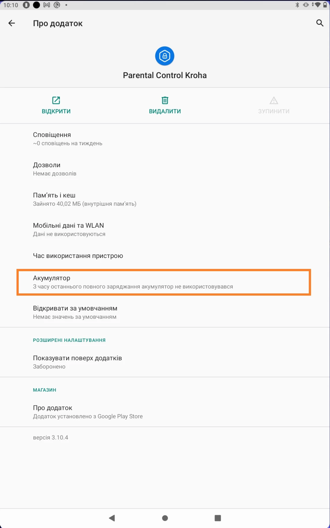 - Відкрийте "Налаштування" на пристрої дитини > розділ "Додатки та сповіщення" > Усі додатки (Про додаток) > Parental Control Kroha > Акумулятор > Робота у фоновому режимі > не обмежена.