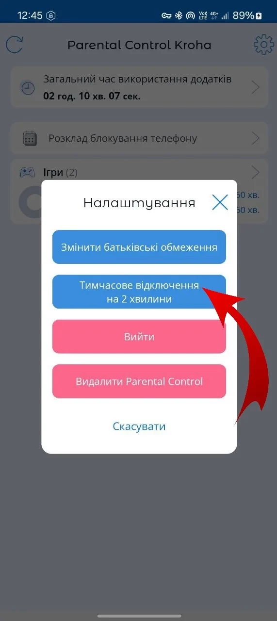 Потім відкрийте застосунок Parental Control Kroha на пристрої дитини > Натисніть іконку шестерні > натисніть кнопку "Тимчасове відключення на 2 хвилини" > введіть PIN-код. Це необхідно, щоб налаштування на пристрої дитини не блокувалися 2 хвилини, і ви могли перевірити їх.