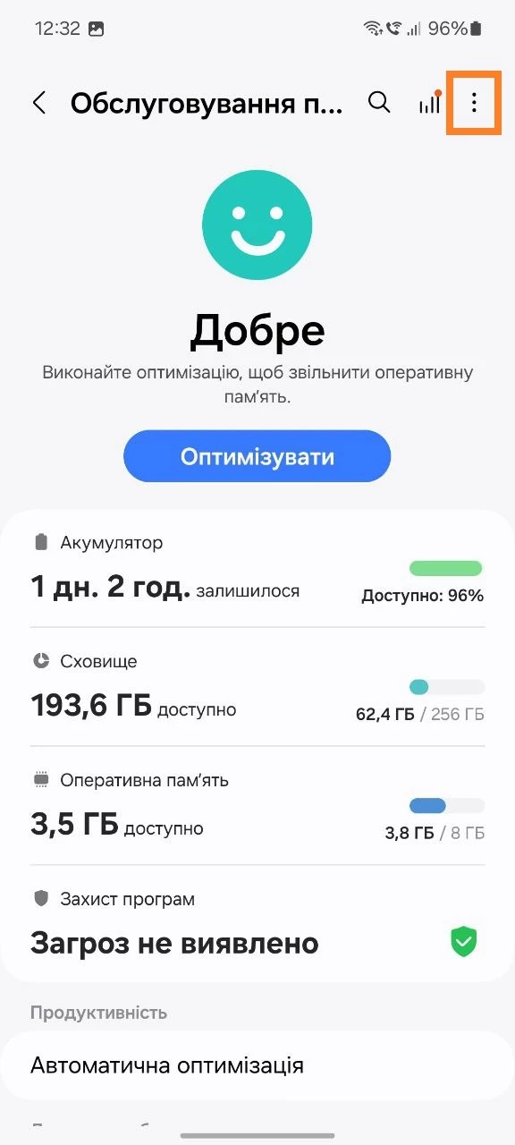 - Також у розділі "Обслуговування пристрою" перейдіть до "Акумулятор", відкрийте > пункт "Режим живлення" > виберіть опцію "Висока продуктивність" і відключіть "Адаптивний режим живлення" > поверніться на крок назад і у верхньому куті екрана натисніть на іконку меню (три вертикальні точки) > відкрийте меню "Параметри" > вимкніть усі перемикачі.