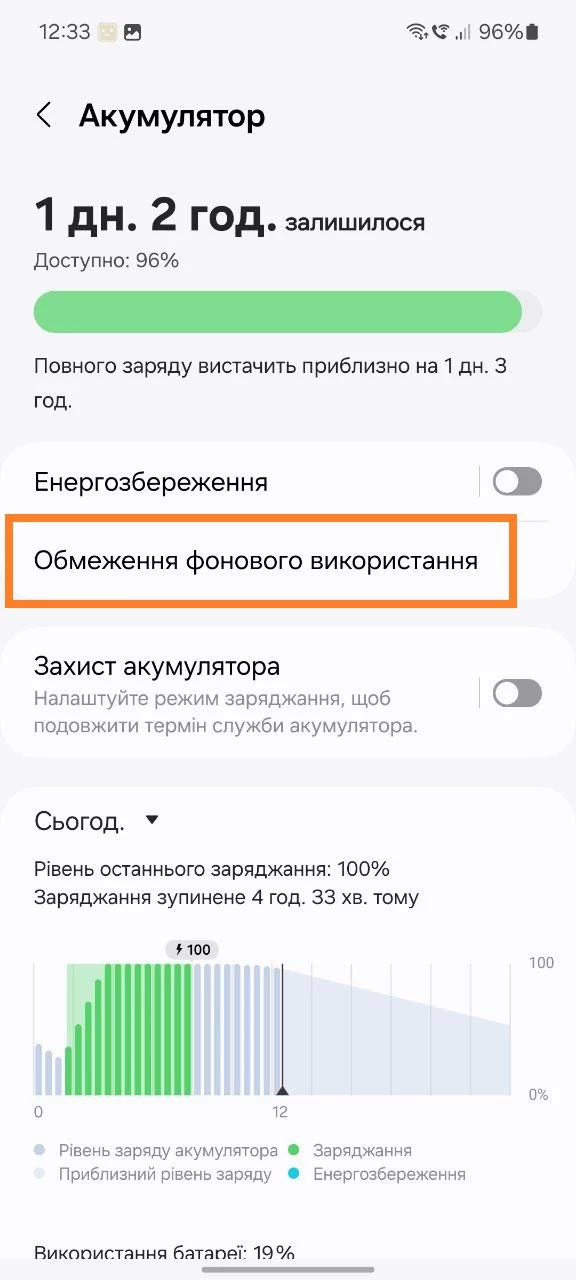 - Поверніться до меню "Налаштування" > "Обслуговування пристрою" > перейдіть до "Акумулятор" > Обмеження фонового використання > перевірте, щоб застосунок Parental Control Kroha не був доданий до сплячих програм;