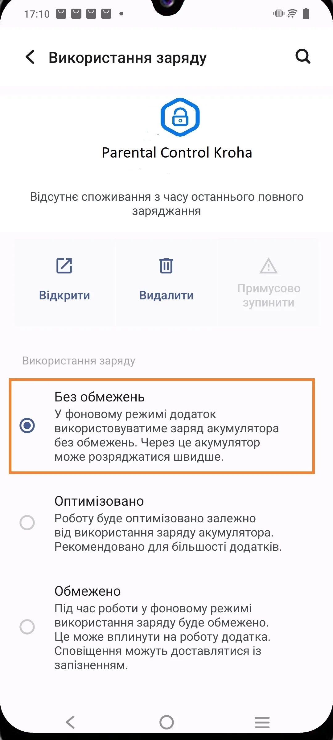 - Відкрийте "Налаштування" на телефоні дитини > перейдіть до розділу "Програми" > Всі програми > Parental Control Kroha > Акумулятор > Використання заряду "Без обмежень".