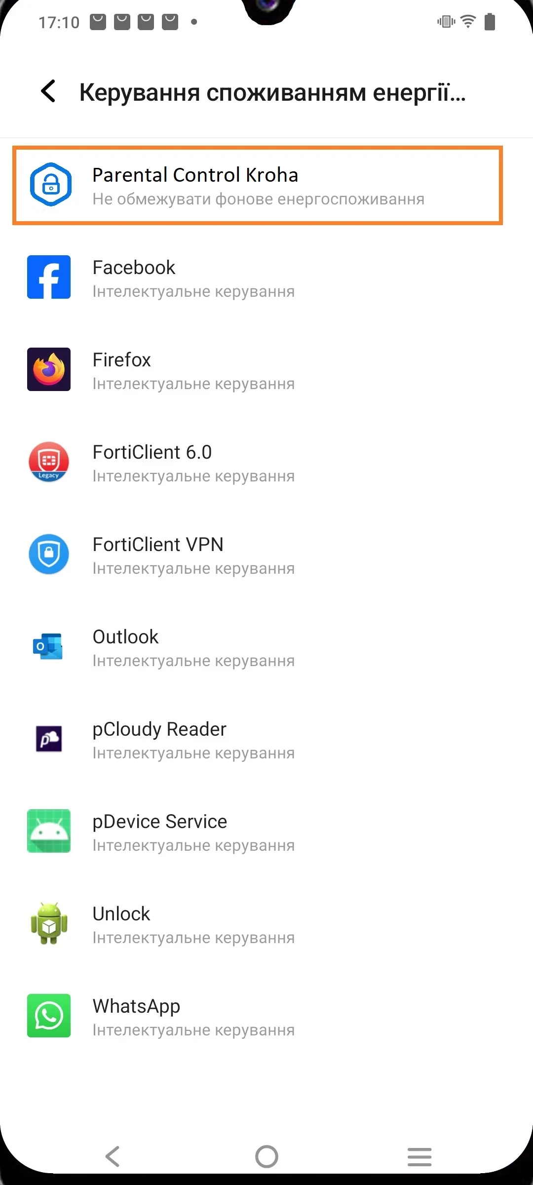 - Відкрийте Налаштування на пристрої дитини > Акумулятор > Керування споживанням енергії у фоновому режимі (На телефонах з Funtouch OS версії нижче 3.0 зайдіть у iManager > Управління енергоспоживанням > Високе енергоспоживання) > знайдіть застосунок Parental Control Kroha і увімкніть "Не обмежувати фонове енергоспоживання".