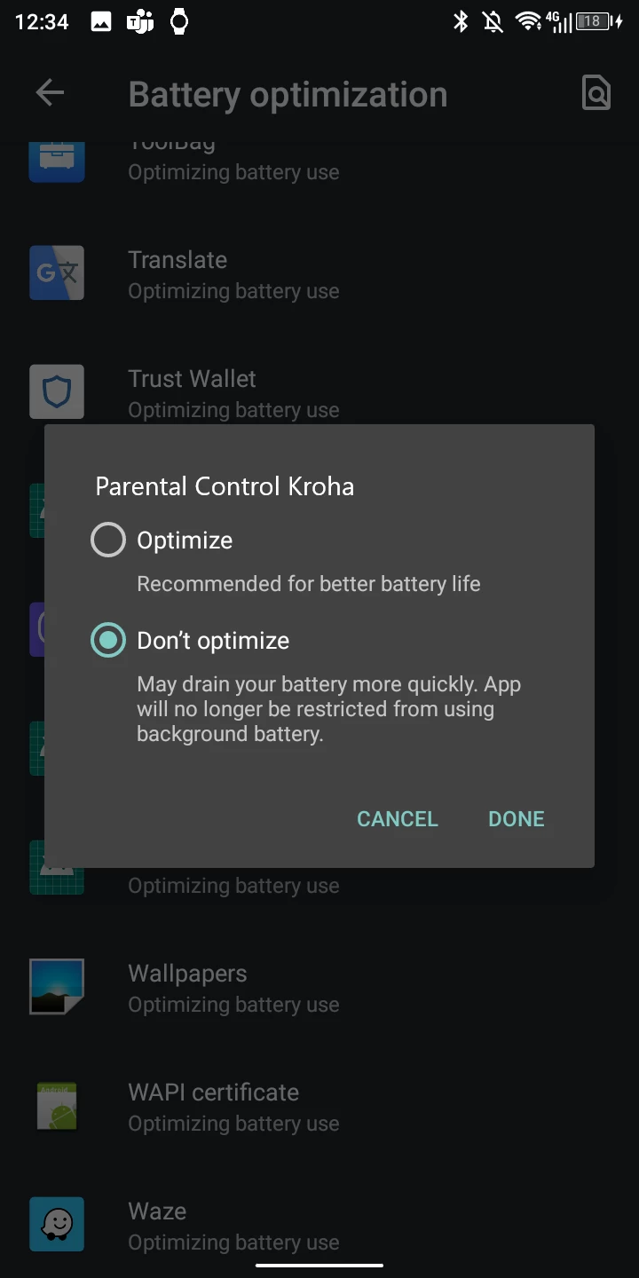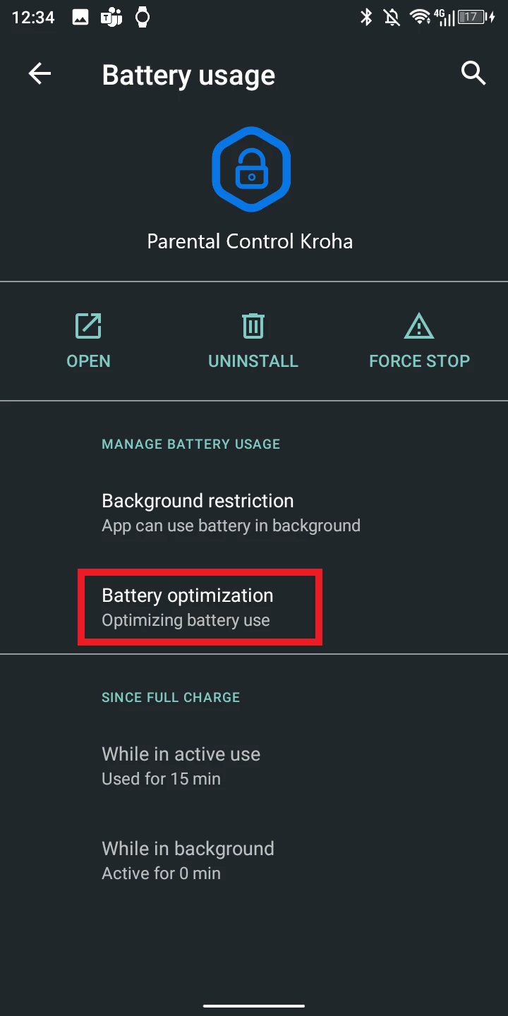 - 在您孩子的设备上打开“设置” > 进入“应用和通知” > 选择Kroha 家长控制应用程序 > 选择“电池使用情况”(或“高级设置”) > 选择“电池优化” > 选择“不优化”。