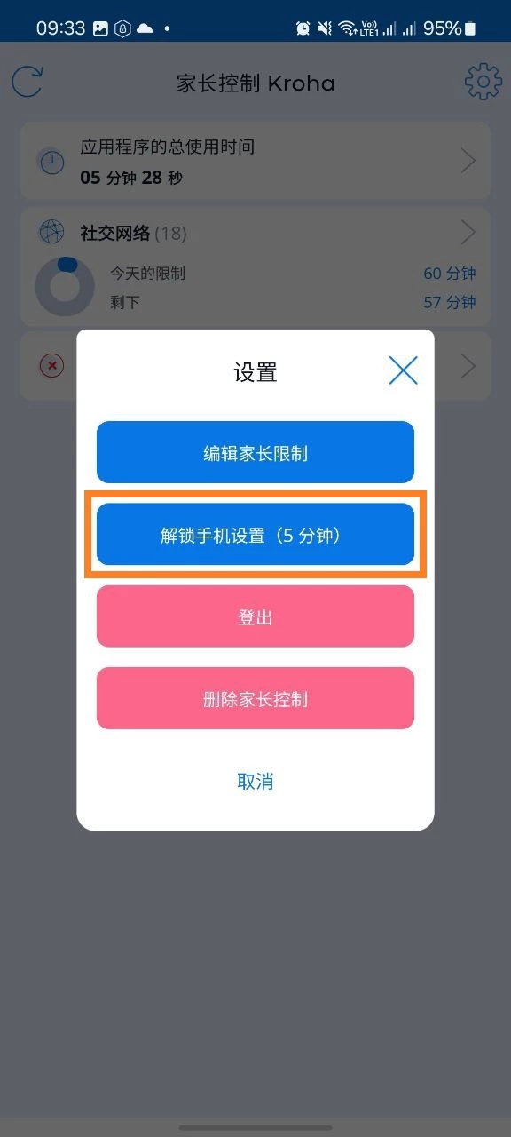 首先,在您孩子的设备上打开Kroha 家长控制应用程序 > 点击齿轮图标 > 点击“编辑家长限制” > 输入PIN码 > 如果出现任何设置向导,请按要求进行操作。