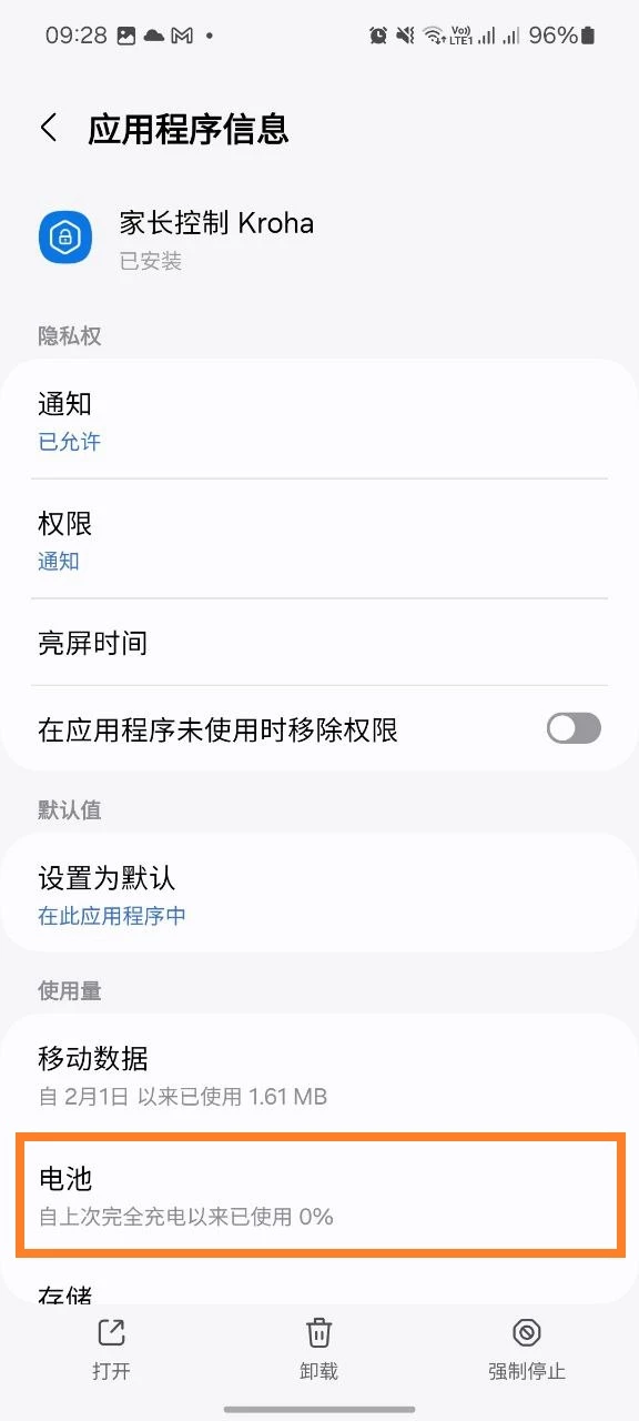 - 在您孩子的设备上打开设置 > 应用程序 > Kroha 家长控制应用程序 > 电池 > 不优化。