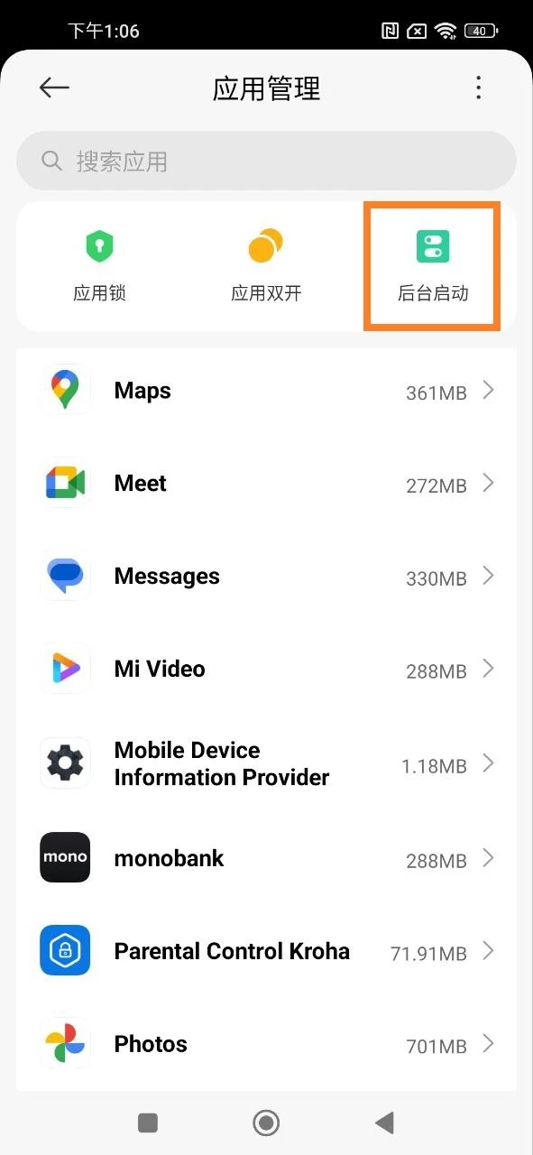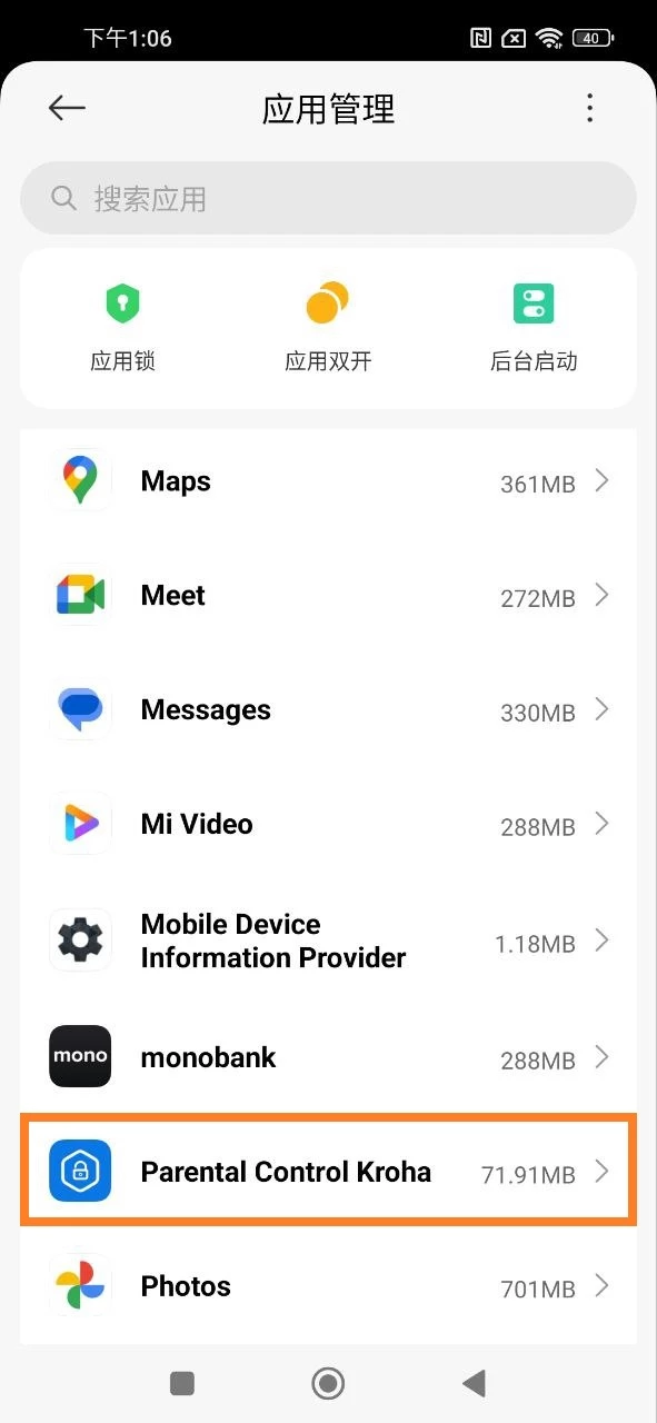 - 自启动设置:在您孩子的设备上打开设置应用 > 打开应用程序部分 > 管理应用 > 后台自启动 > 找到Kroha 家长控制应用程序 > 打开开关。