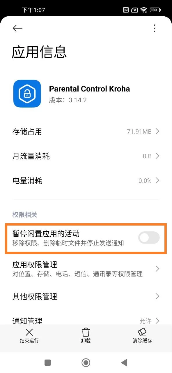 - 在您孩子的设备上打开设置应用 > 打开应用程序部分 > 管理应用 > 找到Kroha 家长控制应用程序 > 关闭“在不使用时暂停应用”旁边的开关。